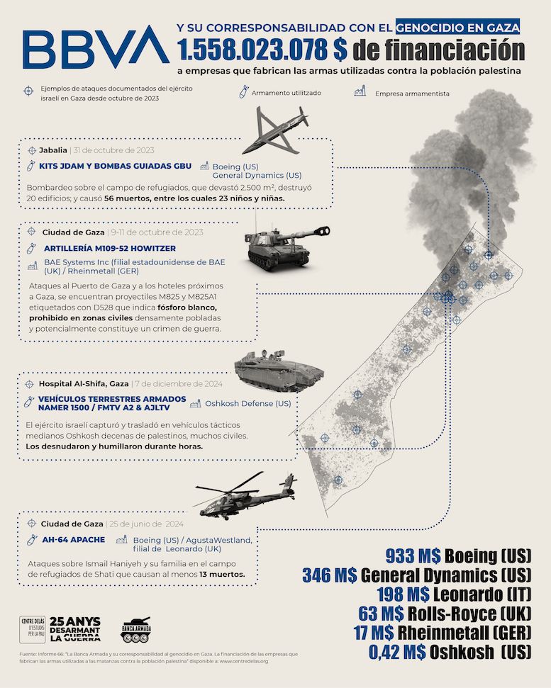 El BBVA superó los 10.000 millones de € de beneficios en 2024, un 25,4% más que en 2023, que ya era de récord. Parte de estos beneficios provienen de los 1.558 millones de $ invertidos en empresas de armas que se lucran del genocidio. Ha financiado empresas de armas como Boeing, General Dynamics, Rolls-Royce, Leonardo, Rheinmetall, o Oshkosh. Todas ellas han fabricado armas utilizadas en ataques documentados contra población civil en Gaza.