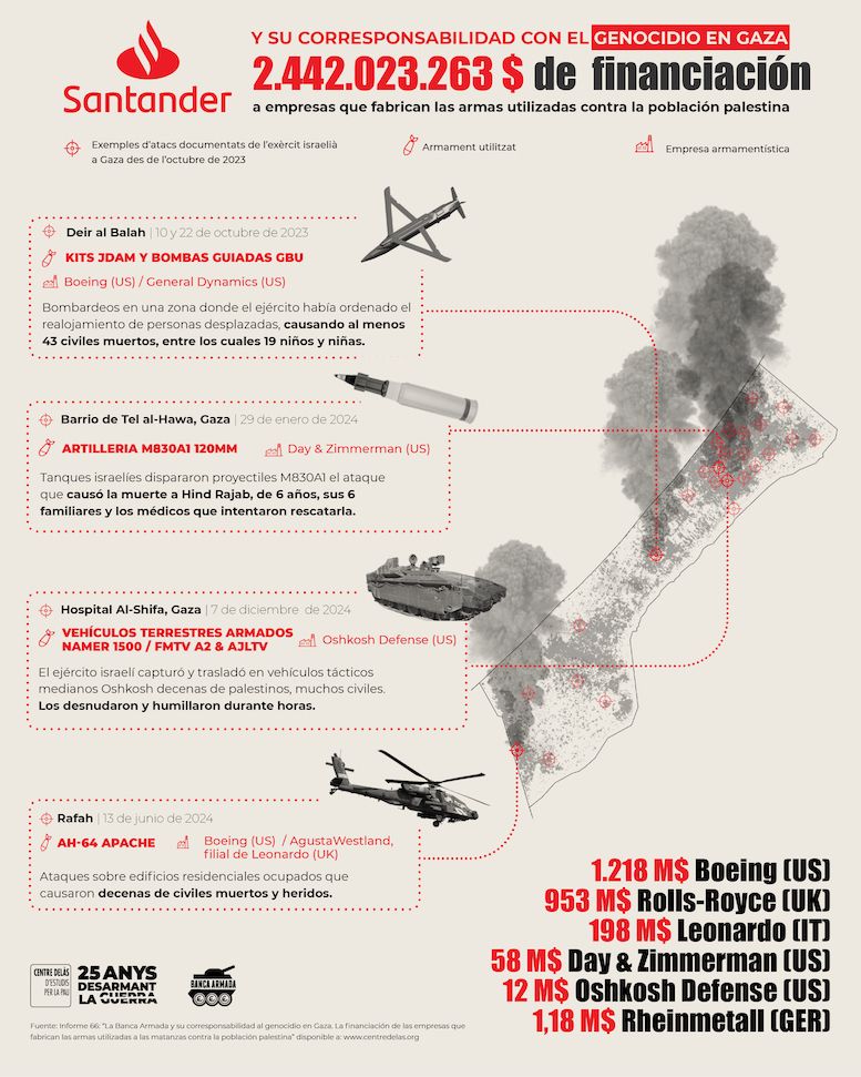 En 2024 el Banco de Santander ganó 12.574 millones de €, un 14% más que en 2023, encadenando 3 años consecutivos de récord. Parte de estos beneficios provienen de los 2.442 millones de $ invertidos en empresas de armas que se lucran del genocidio. Ha financiado a empresas de armas como Boeing, Rolls-Royce, Leonardo, Rheinmetall, Day & Zimmerman o Oshkosh. Todas ellas han fabricado armas utilizadas en ataques documentados contra población civil en Gaza.