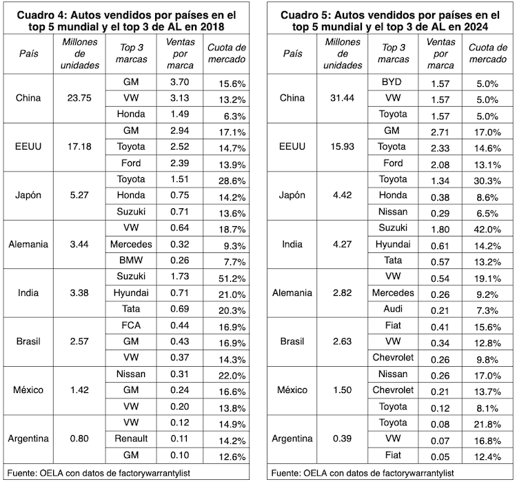 En conclusión, los fabricantes estadounidenses han perdido importancia en el mercado mundial y la tendencia muestra que no lograrán remontar las posiciones. Las empresas clave GM y Ford solo dominan en EEUU (véanse cuadros 4 y 5), un mercado que, aunque es el segundo en importancia, se ha achicado. Mientras, GM perdió la competencia en China, el mercado más grande. En otras regiones, como América Latina, también los estadounidenses han perdido posiciones, GM dejó de ser la marca más importante en Brasil. En México, esta se mantiene segunda (con su marca Chevrolet), pero ha perdido cuota (frente a Toyota), y vende menos autos. Estos dos mercados, además de ser los más grandes de AL, están en ascenso, con marcas asiáticas en crecimiento. En Argentina, GM ya no está dentro de las principales marcas. En suma, la guerra comercial, la sustitución de importaciones y la repatriación de inversiones, lanzada desde Washington resulta tardía y tiene pocas probabilidades de lograr revertir la situación en el mediano y largo plazo. Las empresas asiáticas han superado a las estadunidenses en innovación y están mejor posicionadas en el mercado.