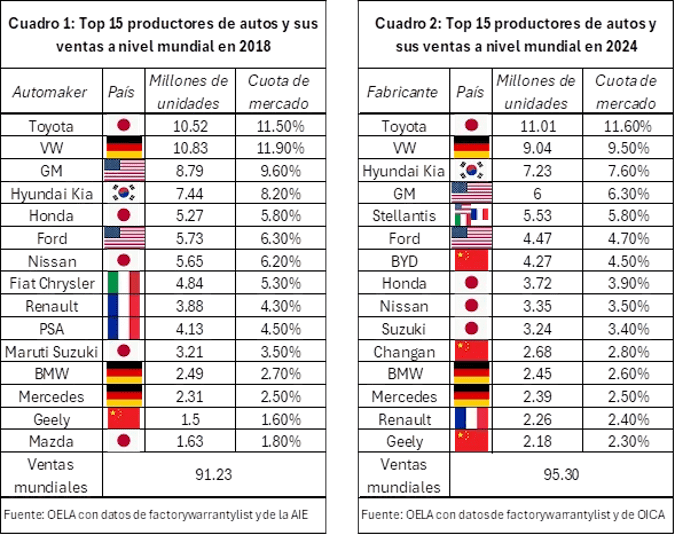 En 2018, el top 15 mundial de marcas absorbía el 85.7% de las ventas, en 2024, solo el 73%, lo que implica que el mercado se ha desconcentrado. La aparición de nuevos competidores, especialmente chinos (Jac, Chirey, Great Wall Motors, entre otros) han ganado posiciones en el mundo. El ascenso de estos fabricantes plantea mayores dificultades para las marcas estadounidenses.