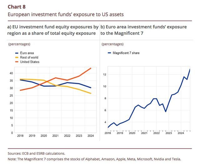 Y continuaba poniendo el foco en el contagio de los desequilibrios estadounidenses a la Unión Europea: “En 2024, aumentaron las preocupaciones sobre la concentración de activos de entidades no bancarias de la UE en Estados Unidos, especialmente en acciones de inteligencia artificial. (…) La creciente concentración de las carteras de los fondos de inversión en un número relativamente pequeño de acciones tecnológicas ha aumentado su vulnerabilidad a este tipo de correcciones de precios. (…) Además, la fuerte interconexión del sector no bancario amplifica el riesgo, ya que las perturbaciones podrían fácilmente extenderse a otros mercados críticos, desestabilizando potencialmente el sistema financiero en general”, alertaba. (Ver gráfico)