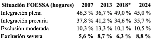 La exclusión no es un fracaso individual sino el resultado de estructuras económicas y políticas que generan vulnerabilidad. La exclusión severa afecta al 9 por ciento (más de 4 millones de personas), y la exclusión moderada a un tercio de la población.