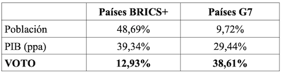 Como ejemplo de esta subrepresentación del Sur Global podemos comparar el derecho de voto de los países que componen los BRICS+ y los 7 países occidentales del G7 en el Fondo Monetario Internacional (FMI). Los votos de los países BRICS+ solo alcanzan a un tercio de los votos de los países del G7 mientras que su población es cinco veces superior y su PIB un 33 % superior. Esta tremenda desigualdad, absolutamente injustificable desde cualquier punto de vista, nos permite hacernos una idea de la tremenda subrepresentación del Sur Global en las instituciones de gobernanza global. Subrepresentación que no es sólo en el FMI sino que también alcanza al Banco Mundial y otras muchas instituciones que gobiernan “de facto” el mundo.